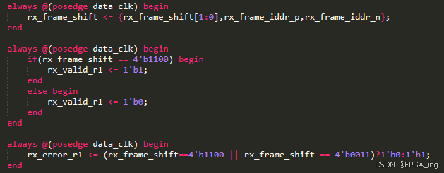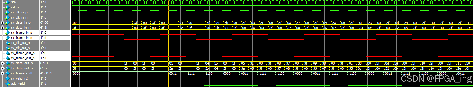 因为是 IDDR 采样,在 Data_clk 第一个时钟周期采集到的Rx_frame 为11,下一个时钟周期采集到值为00;data_clk上升沿采集的为 p,下降沿采集的为n;