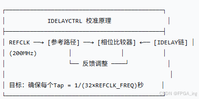 IDELAYCTRL 是 Xilinx FPGA 中一个关键的延迟校准控制器,提供一个稳定的参考时钟(通常 200MHz 或 300MHz),它为 IDELAYE2 和 ODELAYE2 提供精确的延迟校准,确保延迟抽头(Tap)的延迟值在各种工艺、电压和温度(PVT)条件下保持一致。