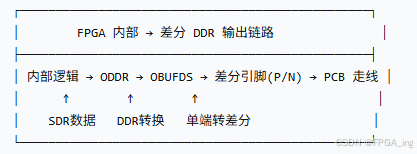 ODDR 是一个专用的输出双数据速率寄存器,用于将 FPGA 内部的两个单数据速率(SDR)数据流合并为一个双数据速率(DDR)信号通过单个引脚输出。