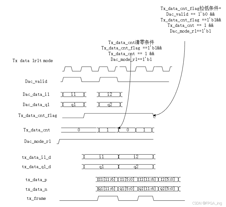 发送链路的工作逻辑与接收链路类似,在 1R1T、FDD 模式下,需生成对应的 TX_FRAME_x 控制信号:发送高 6 位数据时,TX_FRAME_x 信号为高电平;发送低 6 位数据时,TX_FRAME_x 信号为低电平,以此实现发送数据的分段传输。
