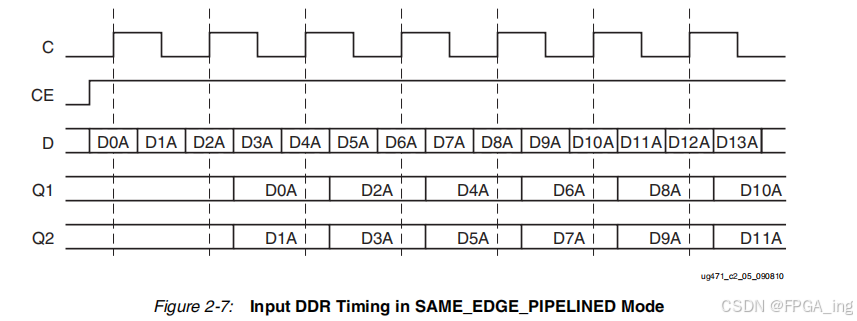 IDDR:将 DDR 数据分解为两个 SDR 数据流(Q1=上升沿数据,Q2=下降沿数据)