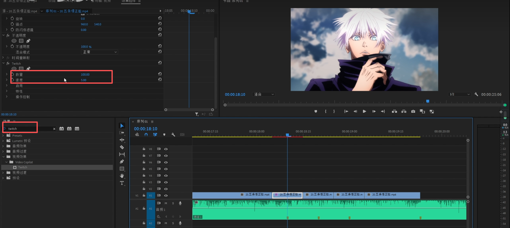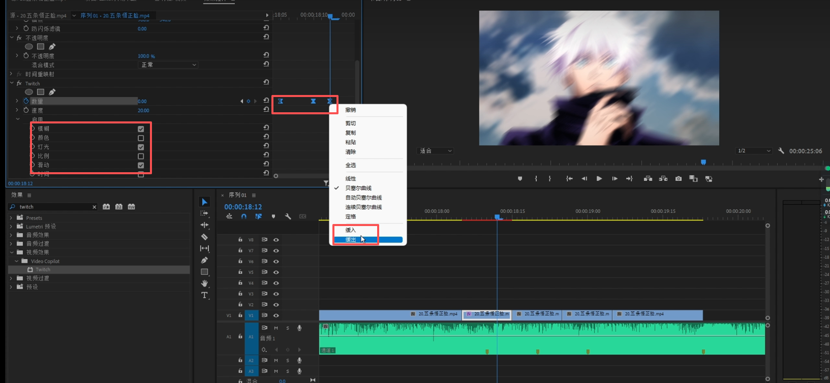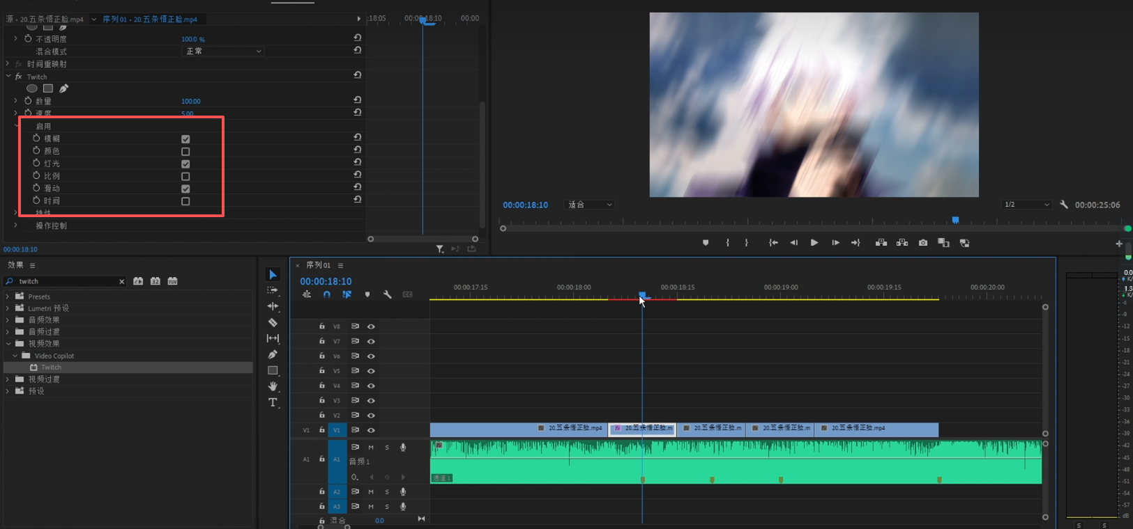 除了基础的抖动转场,Twitch 插件还能实现个性化的晃动效果,通过调整方向、RGB 分割等参数,让画面呈现出独特的动态感,具体操作如下: