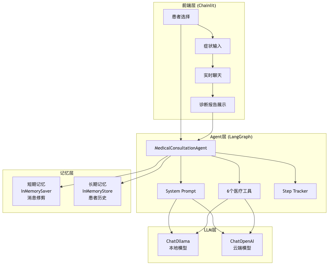 本文将深度剖析一个医疗问诊智能体演示系统,该系统基于LangGraph 和LangChain构建,完整实现了长短期记忆管理、多轮对话控制和结构化问诊流程。通过这个项目的学习,读者将掌握在大模型应用中组织和管理多层次上下文信息的核心方法,理解如何利用状态机原理约束智能体的推理路径,以及如何设计能够深度融入业务逻辑的专业工具集。