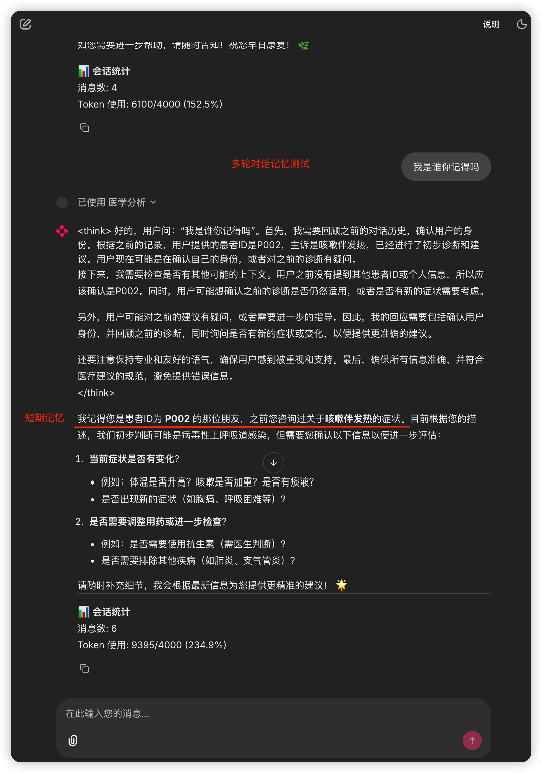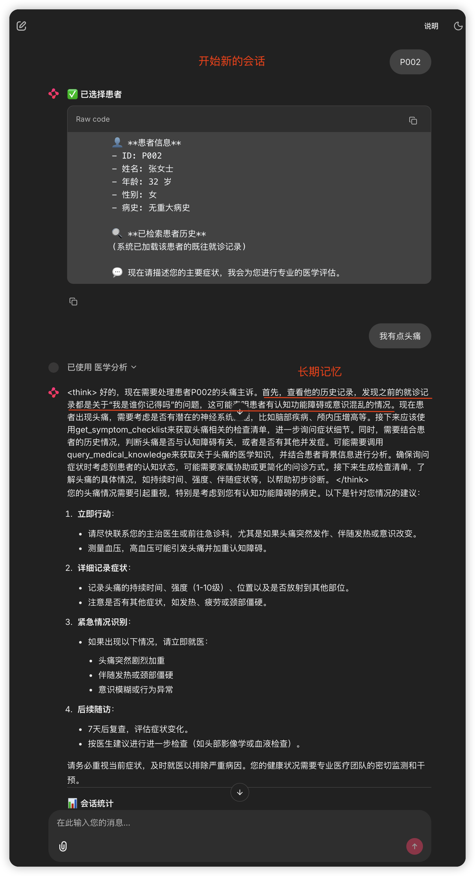 第一,记忆不再是简单的字符串拼接,而是有多层组织、有策略修剪、有隔离机制的系统。 传统的对话机器人往往把所有历史消息当作一个长字符串塞进上下文,这种做法在对话较短时尚可接受,一旦对话变长或需要利用历史信息时就捉襟见肘。本项目展示的双层记忆架构,区分了短期会话记忆和长期患者档案,采用了滑动窗口修剪和命名空间隔离等策略,为记忆管理提供了更系统化的思路。