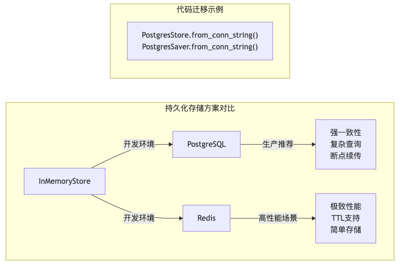 选择哪种持久化方案,需要根据具体的业务需求和基础设施条件来决定。PostgreSQL适合需要强一致性和复杂查询能力的场景,Redis适合需要极致性能和简单键值存储的场景。无论选择哪种方案,迁移成本都是可控的,因为LangGraph提供了统一的抽象接口。