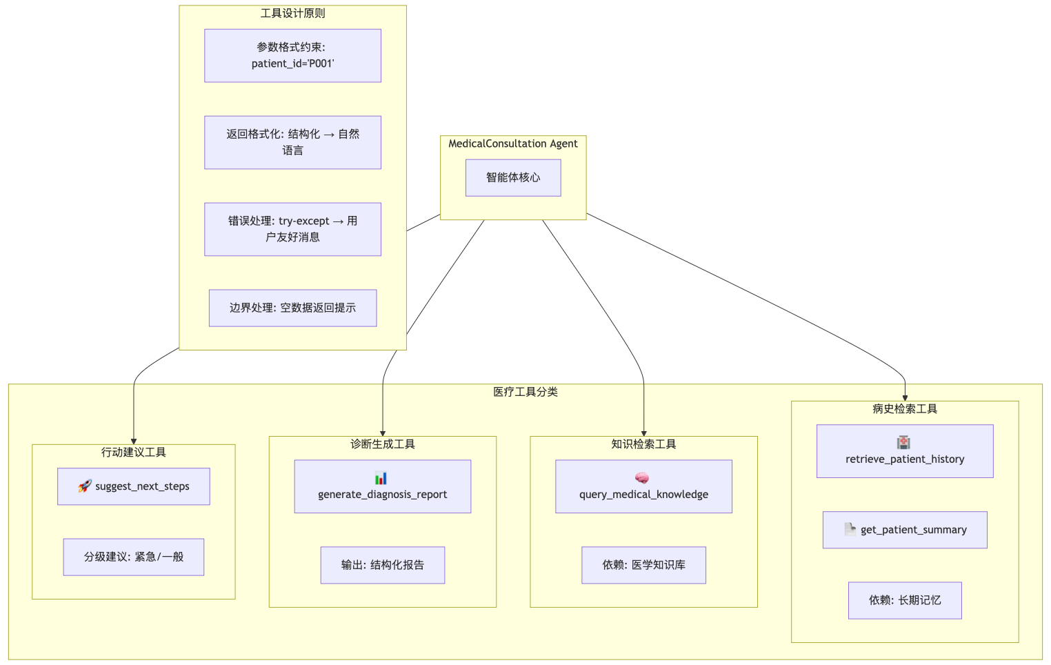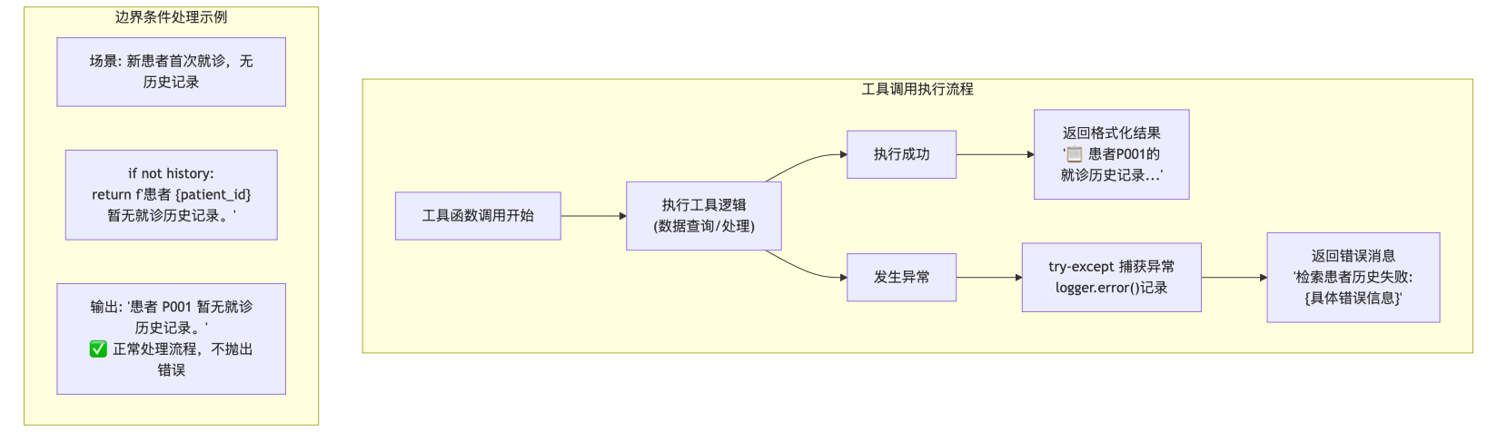 此外,工具设计还考虑了空数据边界的情况。当患者是新患者、尚无就诊历史时,工具应能够正确处理这种空数据场景,返回"患者P001暂无就诊历史记录"这样的提示,而不是返回错误。这种对边界情况的处理能力,是生产级系统与原型系统的关键区别之一。