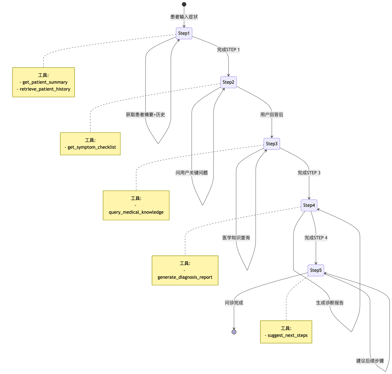 LangGraph智能体层 是整个系统的神经中枢。与简单的工具串联不同,LangGraph在这里扮演着状态机管理者的角色。它不仅决定下一步应该执行哪个工具,更重要的是确保智能体在进入特定阶段之前必须完成前置步骤。例如,智能体在生成诊断报告之前,必须已经完成了病史获取和症状核实两个阶段。这种强制性的阶段约束是医疗场景下保障诊断质量的关键机制。