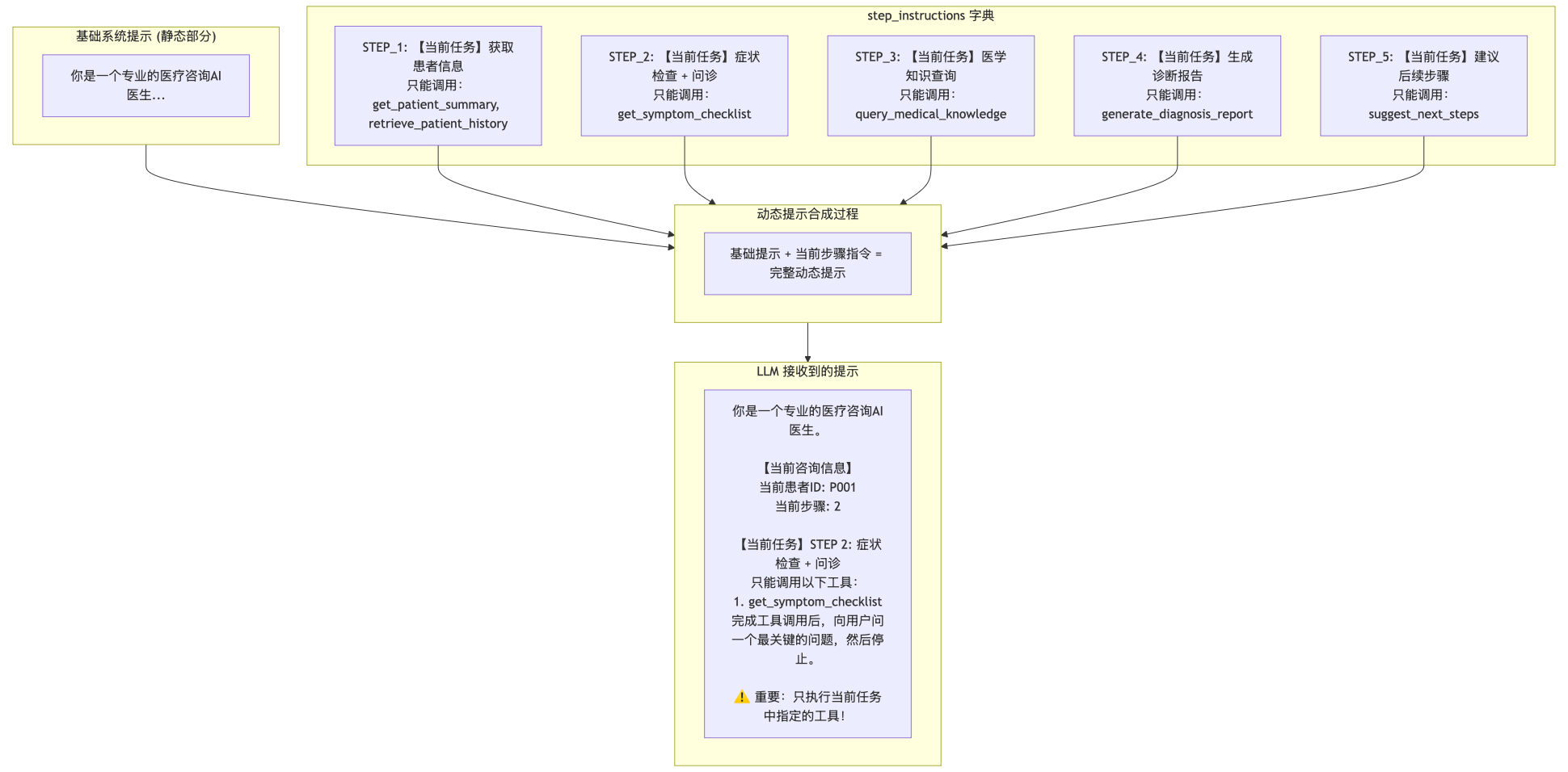 第二,流程不再是模型的自由发挥,而是基于状态机的受控推理。 大模型的一个固有特性是倾向于"话越多越好",但在专业场景中,简洁、精确、有边界才是美德。本项目通过步骤追踪器和动态提示注入,强制模型按照预定义的流程执行,每一步都有明确的目标和约束,既提高了输出的可靠性,也便于审计和调试。