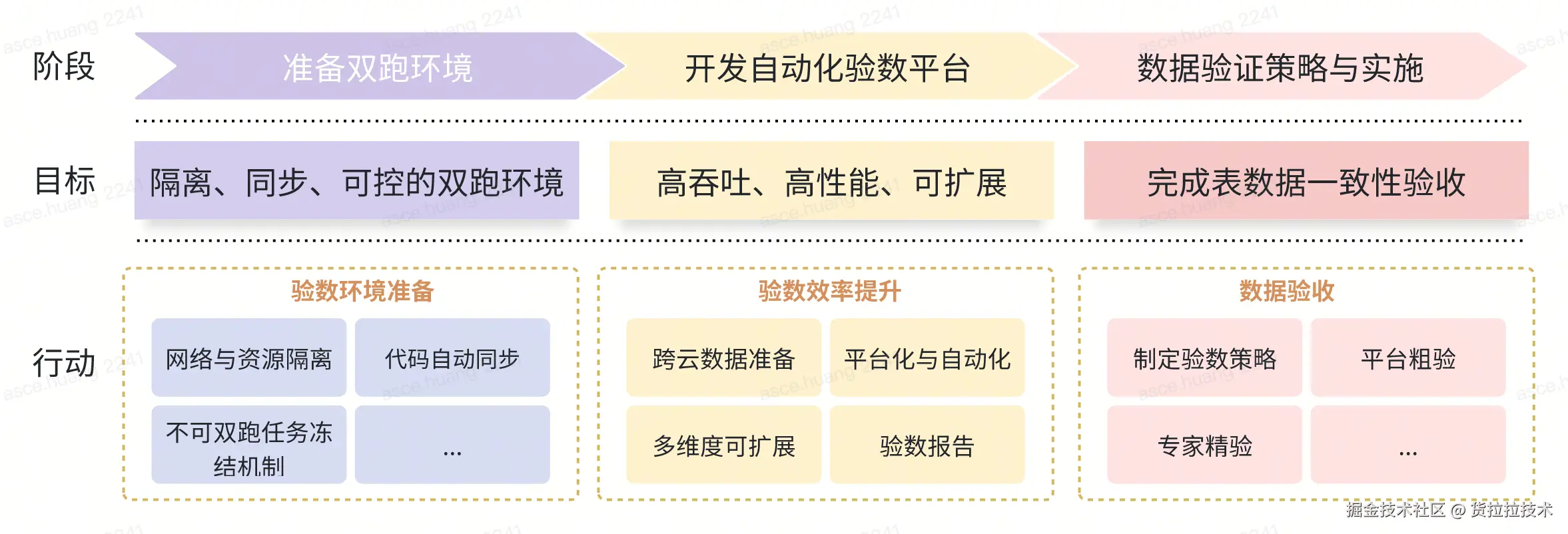 - 分阶段验证(从验证工作的实施步骤和精细度入手)采用"先粗后精"的两阶段流程,先行数快速筛查,再内容深度比对,构建高效的验证流水线。