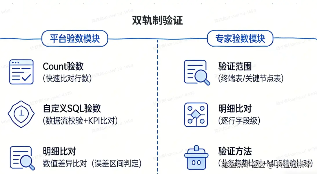 - 关键节点表验证:对承上启下的关键宽表、重度聚合表等进行重点核查,确保核心数据加工节点的准确性。