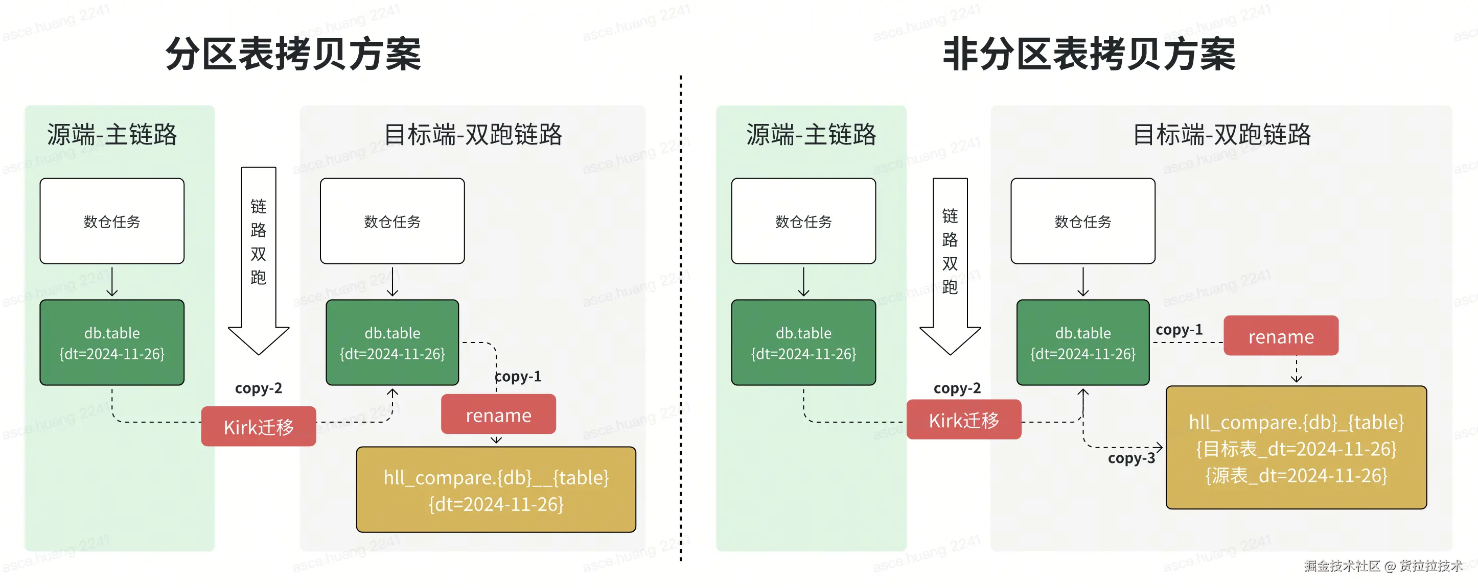 要把数据迁移到同一朵云上,首先要解决的第一个问题就是数据放哪里怎么放的问题,无论验数结果是否通过,最终都会以源端数据为基准去覆盖目标端的数据,因此在验数的准备过程中,第一步先将目标端待验证的数据移动到比对库中避免被源端覆盖(rename操作,不会产生数据读写),第二步使用Kirk(自研数据迁移工具)把源端数据搬迁到目标端正式目录上,通过这两个步骤,既完成了数据迁移任务,又为云内比对做好了数据准备。 这个过程中需要注意非分区表的特殊处理,通常非分区表的大小都比较小(主要是维表),由于非分区表每天都会自行覆盖,为了实现历史状态的回溯,需要专门针对于非分区表保留历史状态的快照,数据准备过程如下: