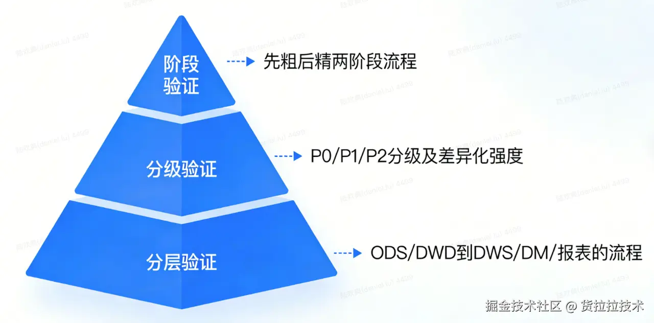 - 分级验证(从数据的重要性和影响面入手),对数据表进行P0(核心)/P1(重要)/P2(一般)分级,实施差异化的验证强度,确保资源精准投放。