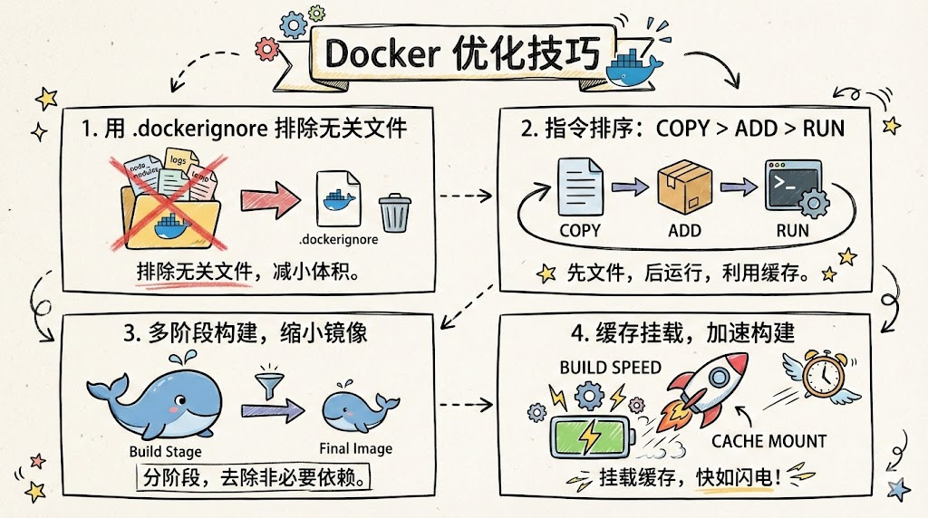 假设一篇"Docker 容器优化"文章,提取关键点:镜像分层、缓存策略、多阶段构建。