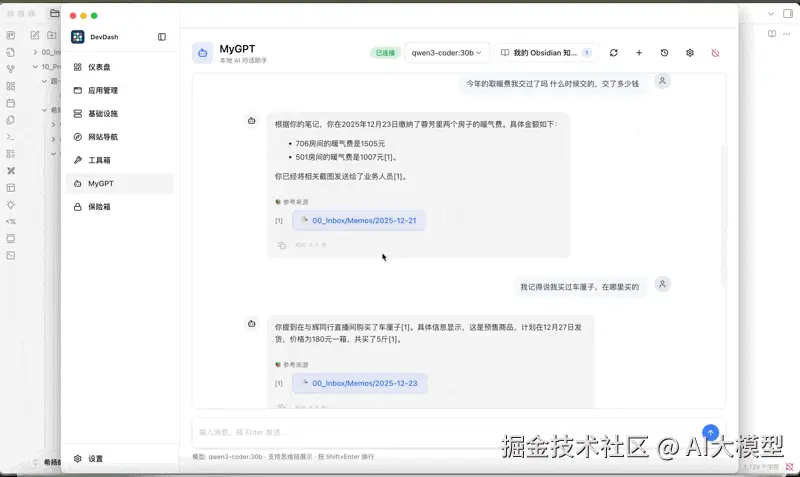 如上图所示,我可以问:"我今年的取暖费交了没,交了多少钱?"它不仅能精准地告诉我答案,还会列出原始文档的参考来源。点击这个参考来源,可以直接跳转到 Obsidian 的原始文档,这是许多其他 RAG 产品所无法做到的体验。