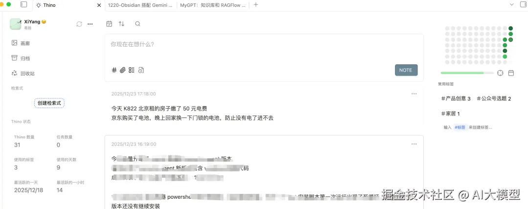 因为我们使用 Obsidian 作为知识库,所有的知识都存储在本地。配合 Thino 插件,可以实现类似于 Flomo 的灵感记忆存储。我便将这个插件与日记功能结合起来,专门用来记录生活中的琐事。