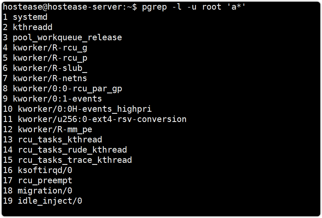 pgrep 命令支持通过部分匹配模式来查找进程。以下命令会列出所有以"a"开头的进程: