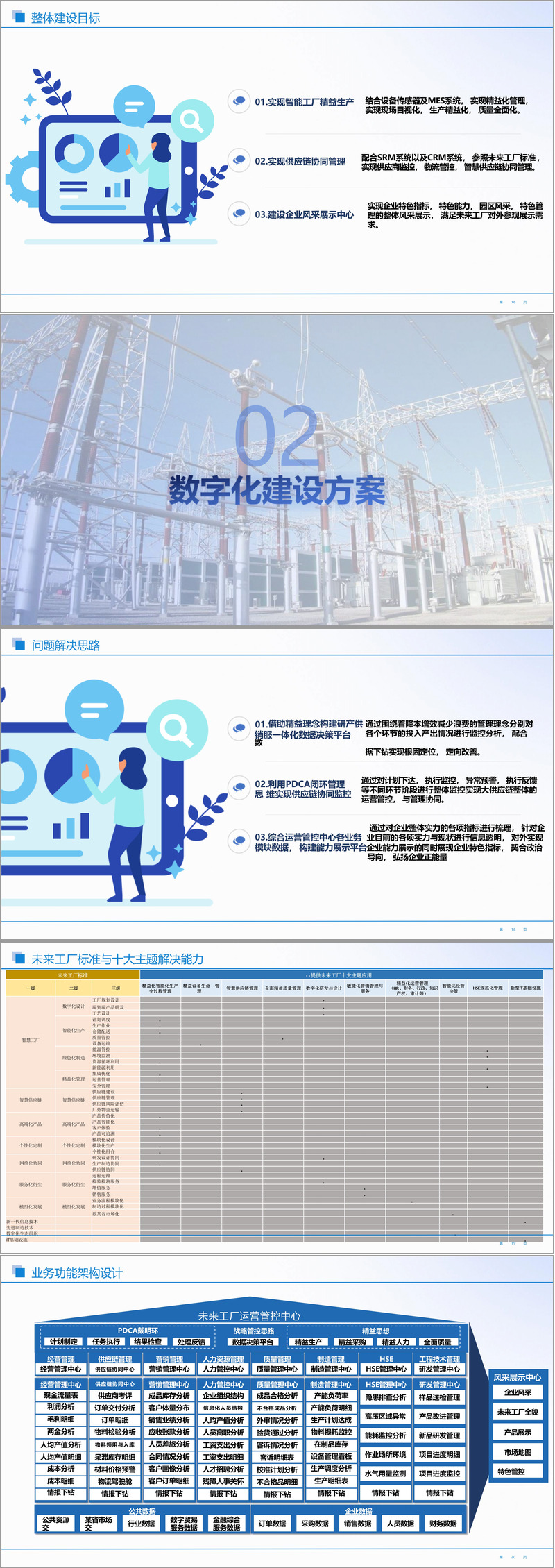 此外,方案特别强调了面向不同对象(如政府部门、行业伙伴、客户等)的展示设计思路,提出了建设企业宣传总屏、未来工厂全貌监控、产品展示、市场地图、未来工厂3D仿真等外部展示模块,旨在生动呈现企业综合实力与数字化建设成果,满足参观、汇报、验收等多场景需求。