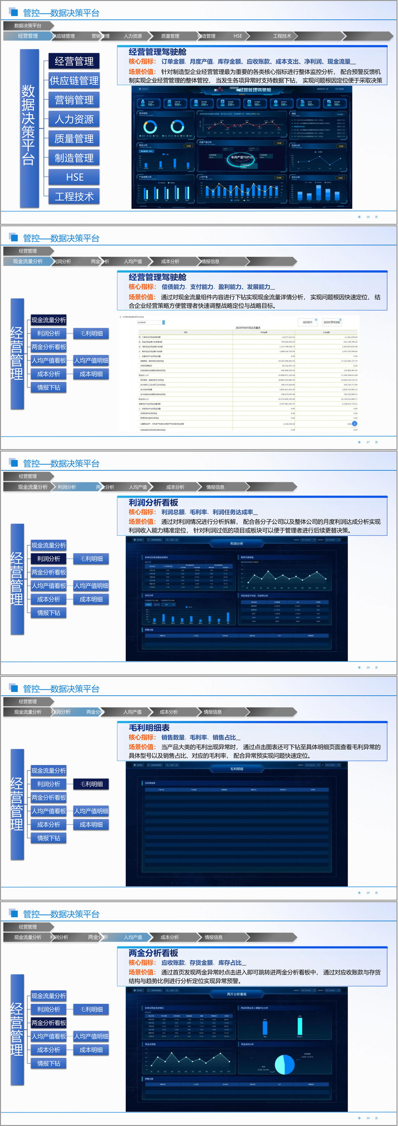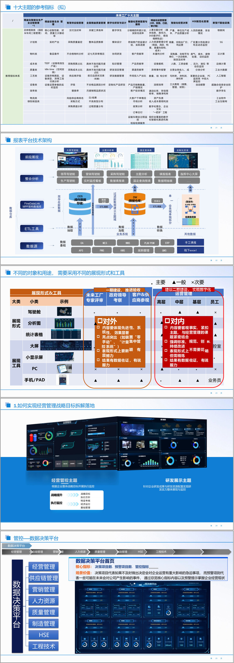 在技术实施层面,方案详细规划了"数据决策平台"作为核心载体。该平台覆盖了经营管理、供应链管理、营销管理、人力资源管理、质量管理、制造管理、HSE(健康、安全、环境)管理、工程技术管理等八大业务领域。文件对每个业务领域的驾驶舱核心指标、下钻分析路径及场景价值都进行了深入阐述。例如,经营管理驾驶舱关注现金流量、利润、两金(应收账款与存货)、人均产值及成本分析,支持管理者快速定位问题、调整战略;制造管理驾驶舱则监控产能负荷、生产进度、物料损耗、在制品库存及设备效率(OEE、MTTR、MTBF等),实现生产过程的透明化与精准管控。