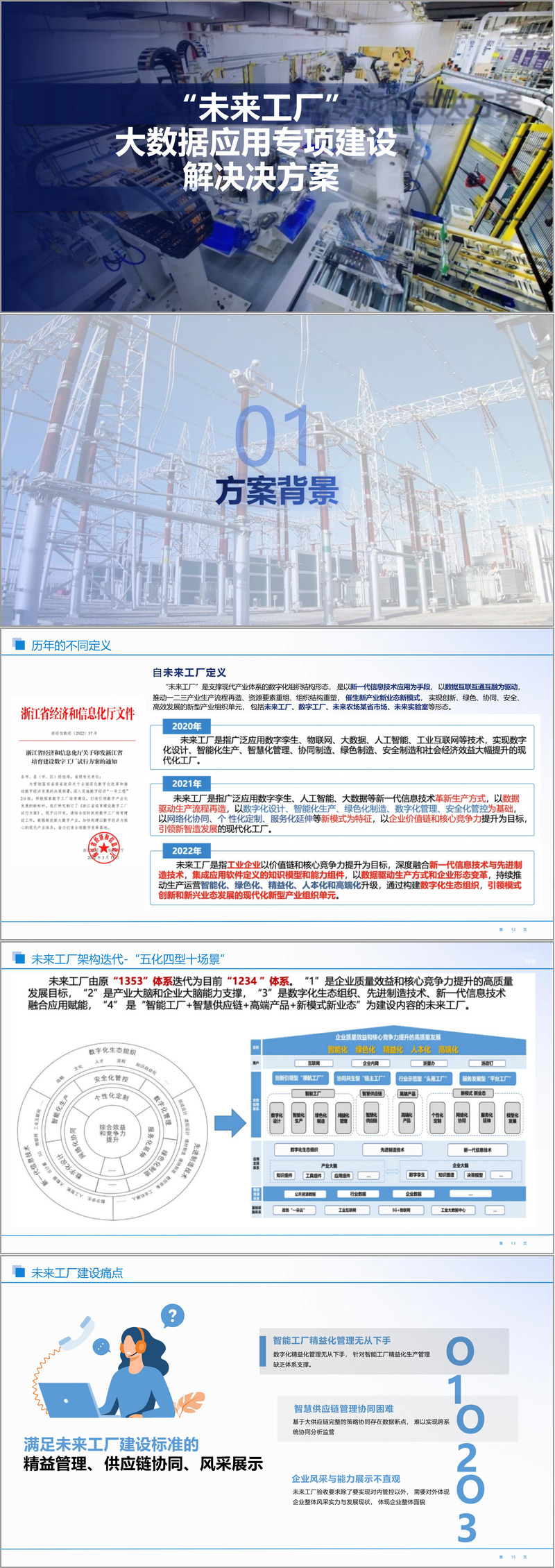 作为一份系统性阐述未来工厂大数据应用的专题解决方案,本文件深刻剖析了在数字经济时代背景下,现代工业企业进行数字化转型的核心要义与实施路径。方案以浙江省关于培育建设数字工厂的政策文件为引领,清晰勾勒出未来工厂的演进脉络与核心架构,并针对建设过程中的核心痛点,提出了兼具前瞻性与实操性的全面解决策略。