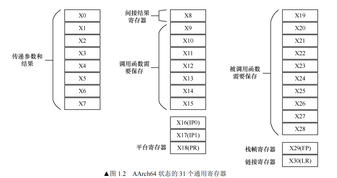 AArch64 执行状态支持 31 个 64 位的通用寄存器,分别是 X0~X30 寄存器,而 AArch32