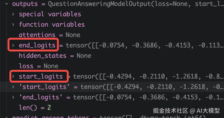 要注意的是,这里模型输出的是start_logits和end_logits,分别表示每个 Token 是答案开头的概率和结尾的"概率"(对数几率)