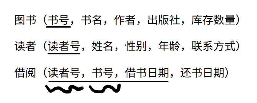 注意此处借阅的主码,题目不明确,但是实际中可能存在同一个人同一本书借阅多次的情况,所以(读者号,书号)不一定能唯一确定一条借阅记录,(读者号,书号,借书日期)作为主码更可靠一些。