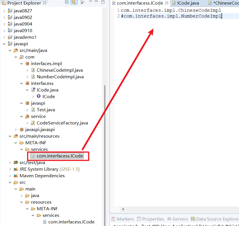 在resources/META-INF/services/目录下,创建名为com.interfacess.ICode的文件(文件名必须与接口全限定名一致),内容为实现类的全限定名: