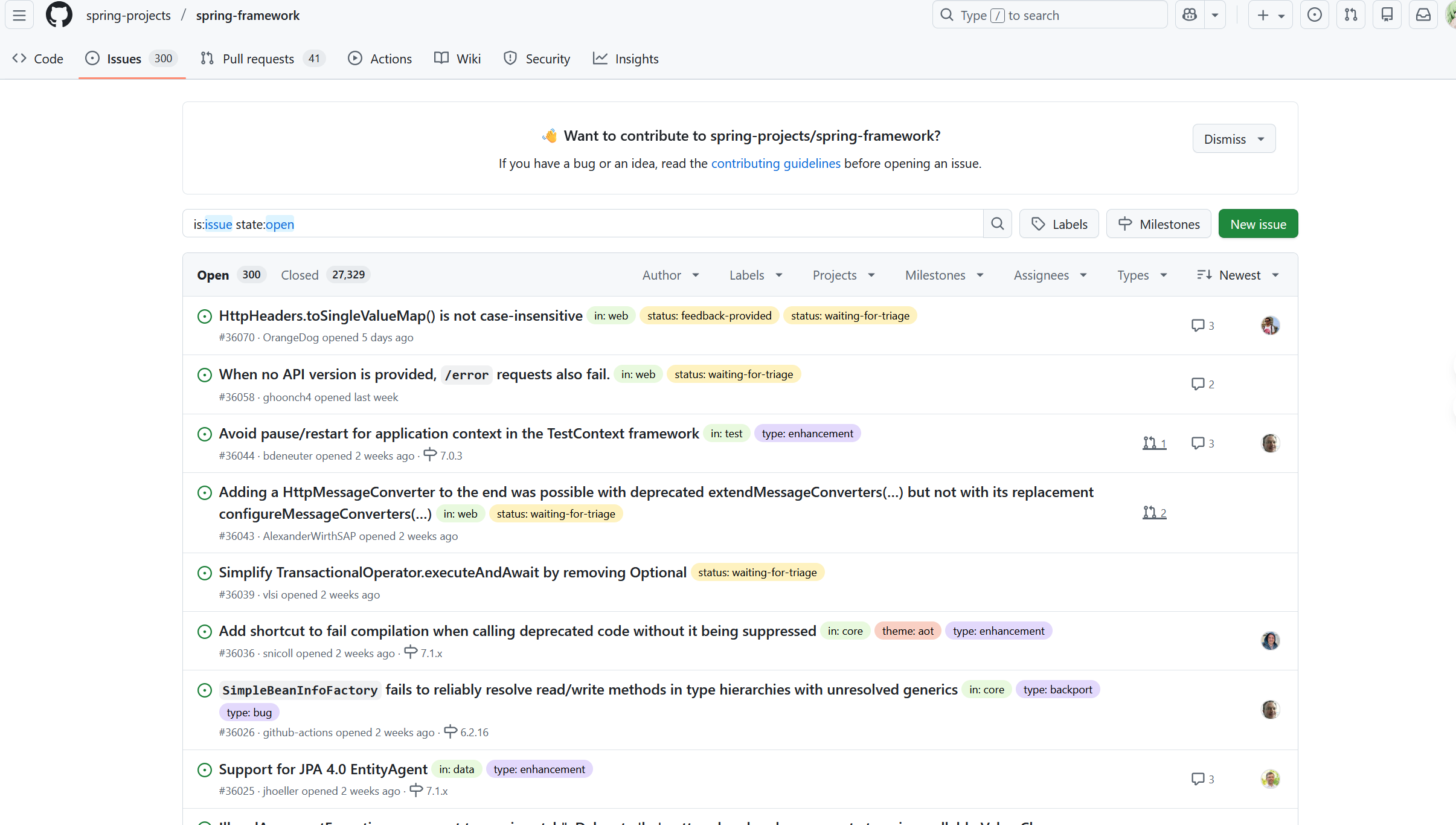 这是正常的,毕竟大部分框架经过了多轮优化和大量实践,一般在使用时不会有什么明显的问题,这时候你可以去看看它的issue,它一般都会有很多待认领的任务,以spring举例:SpringFramework