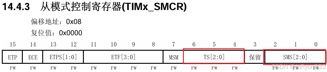 本次主要配置的是触发信号选择以及从模式选择的内容。其中TS用于配置触发信号的选择,SMS用于配置从模式的选择: