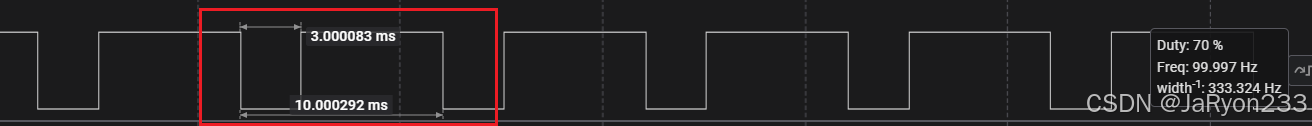 笔者这里选择7200分频,也就是100us计数一次,然后重装载值给99,也就是计数100次,因此生成的PWM方波理论上周期为10ms,然后默认给的CCR为30,也就是占空比为30%,参考代码如下: