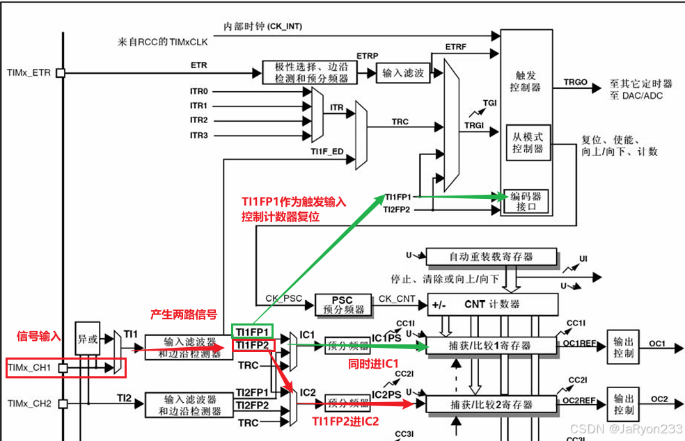 我们先介绍一下利用从模式来实现时需要涉及的相关寄存器,前面说过,要实现占空比测量实际上利用的仍时输入捕获模式,只不过那是一个特例------PWM输入,经过前面介绍,我们可以知道实际上就是利用了两个定时器通道+从模式触发实现,因此这里涉及到的寄存器主要是基础的定时器配置相关的+输入捕获相关的+从模式触发相关的寄存器。