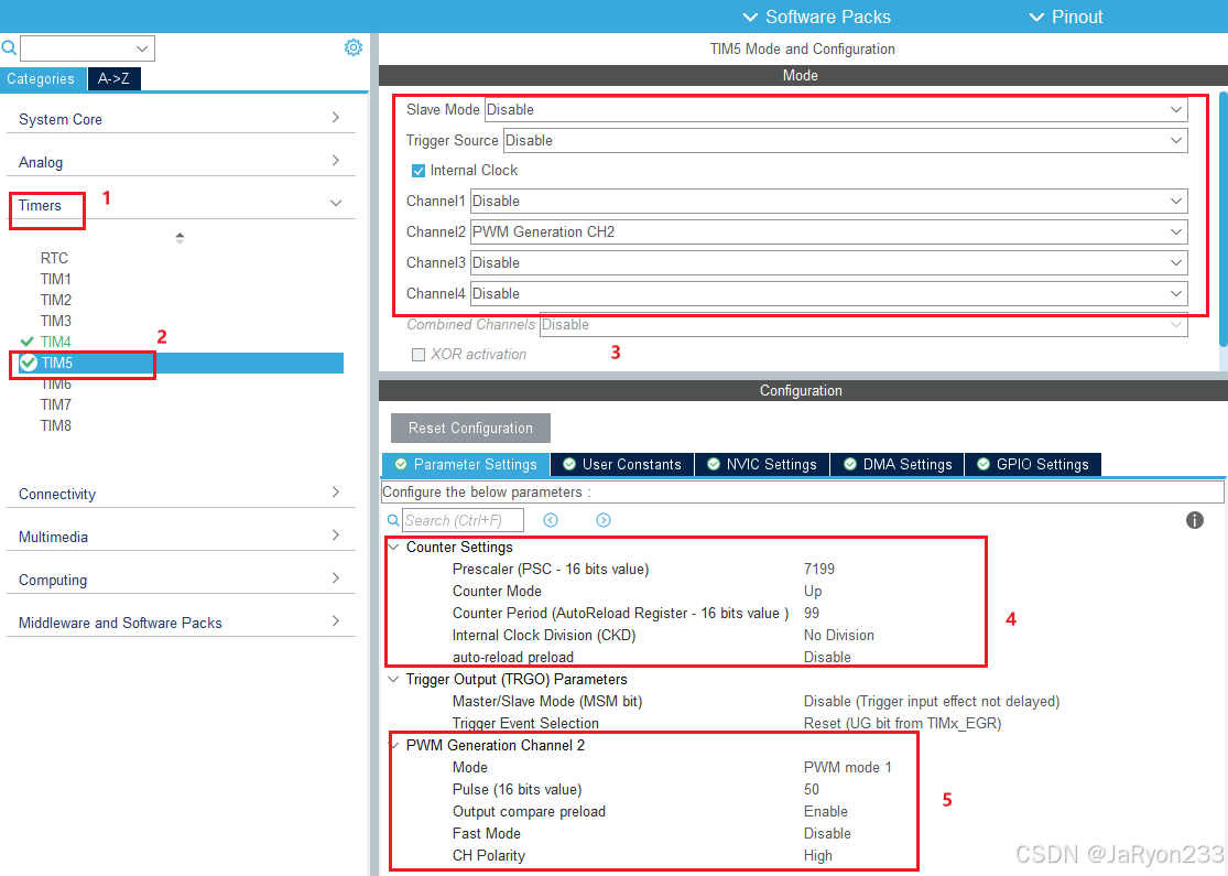 1、TIM5基础配置(PA1引脚配置、预分频系数、自动重装载值、计数方向)