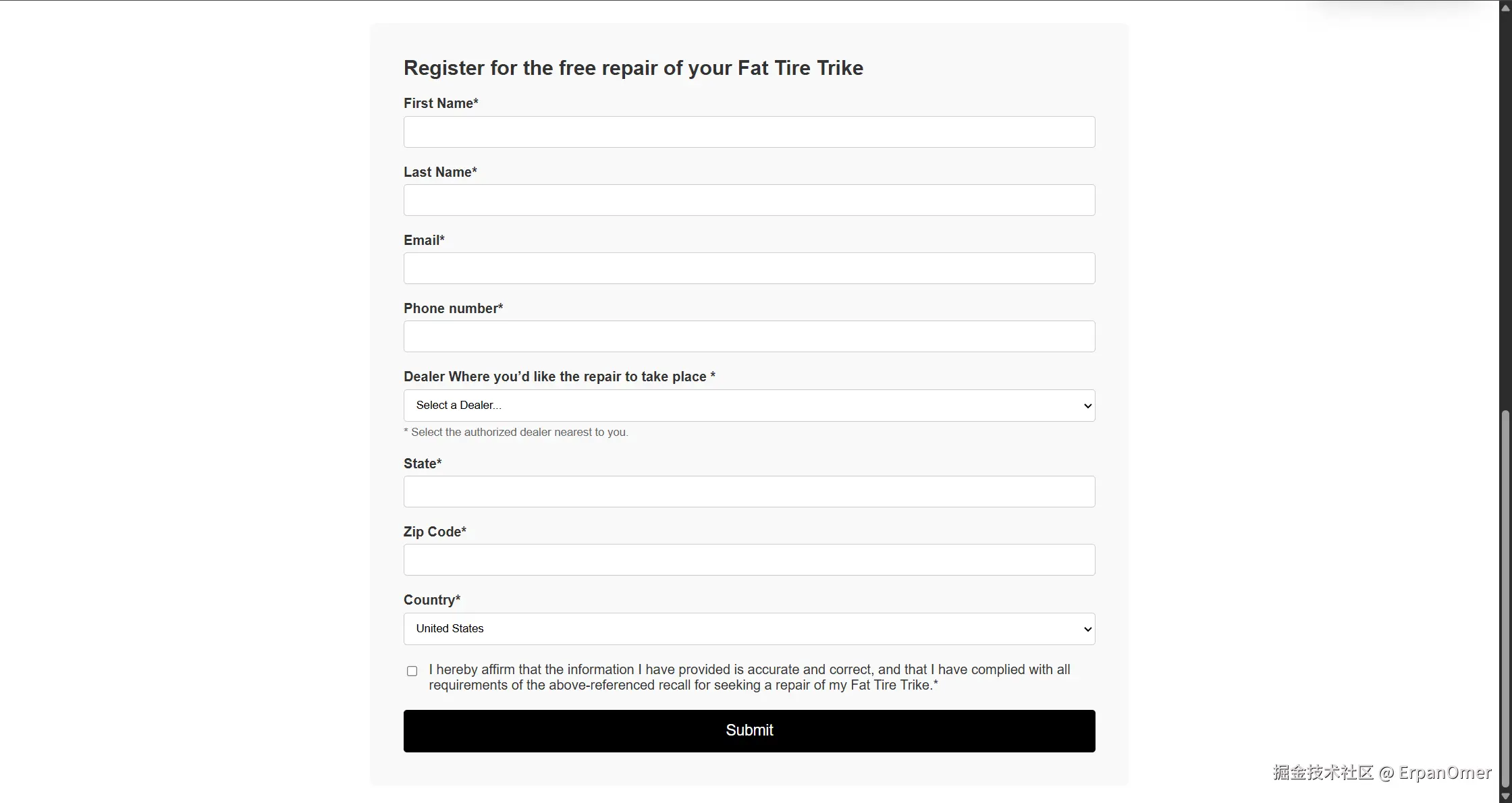 [] * I hereby affirm that the information I have provided is accurate and correct, and that I have complied with all requirements of the above-referenced recall for seeking a repair of my Fat Tire Trike.
