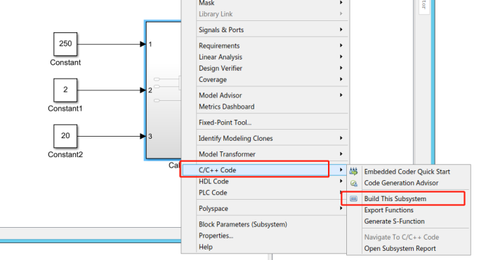 右击选择子系统,选择C/C++ Code,选择Build this Subsystem。