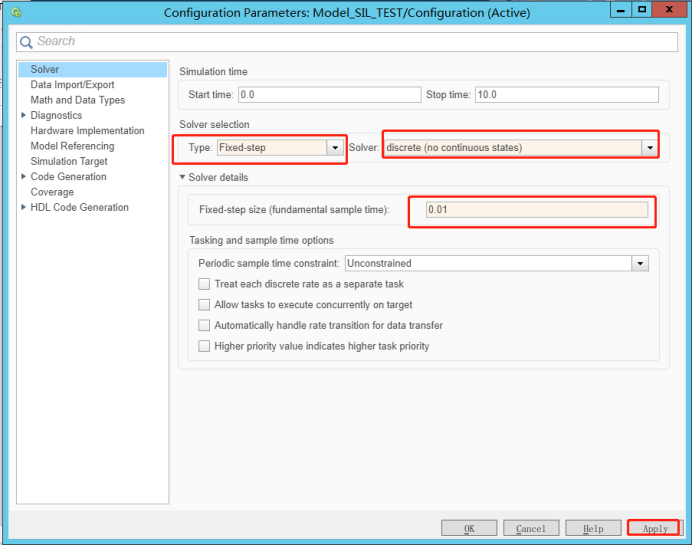 (1)设定固定步长,将求解器设置为离散,固定步长为0.01。