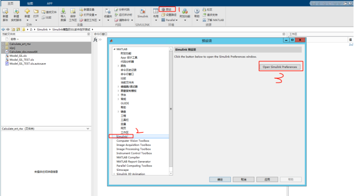 (4)设置代码生成的文件存储路径,点击主页菜单中的预设,在预设项中选择Simulink,然后选择Open Simulink Preference。