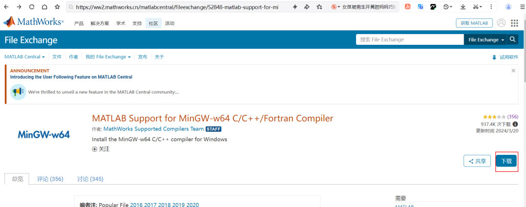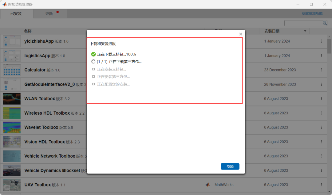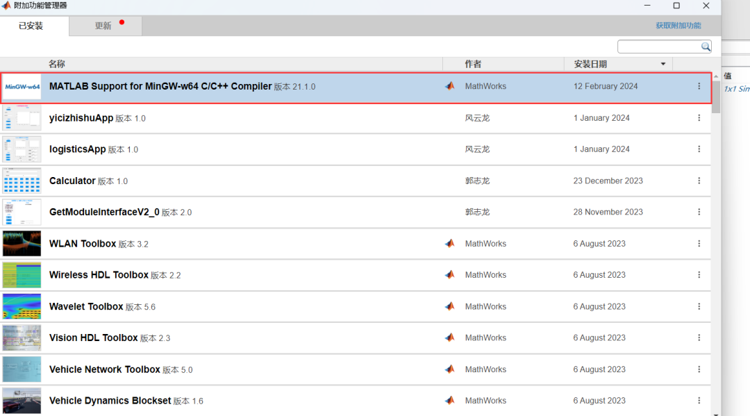 下载之后获得mingw.mlpkginstall文件,在MATLAB的环境下打开,登录注册的账号开始在附加功能管理器中下载MinGW-w64编译器。