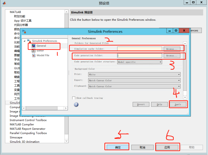 (5)在Simulink Preference中选择模型自动生成嵌入式c代码以及相关文件的路径。