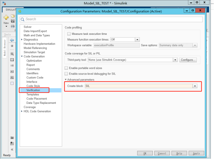 (3)在Code Generation的子选项Verification中选择生成SIL模型。