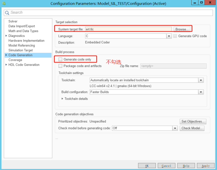 (2)在Code Generation中选代码生成系统文件(ert.tlc选嵌入式(Embedder Coder),不选嵌入式的那个会报错,Generate code only不要勾选,因为要生成SIL。
