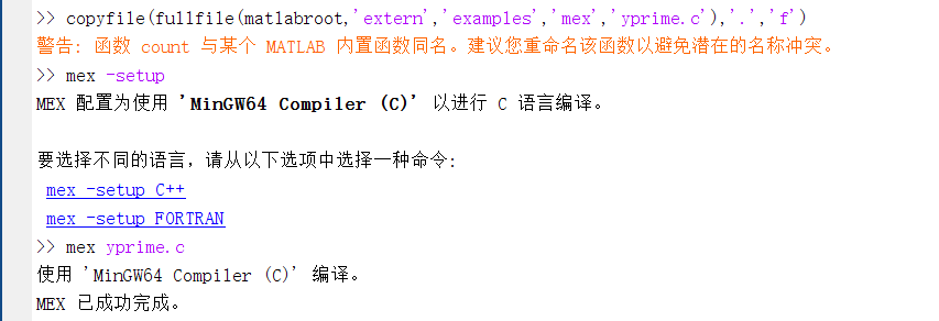 如果在系统中仅安装了 MinGW 编译器,则 mex 命令会自动选择 MinGW。继续下一步。但如果有多个 C 或 C++ 编译器,请使用 mex -setup 选择 MinGW。