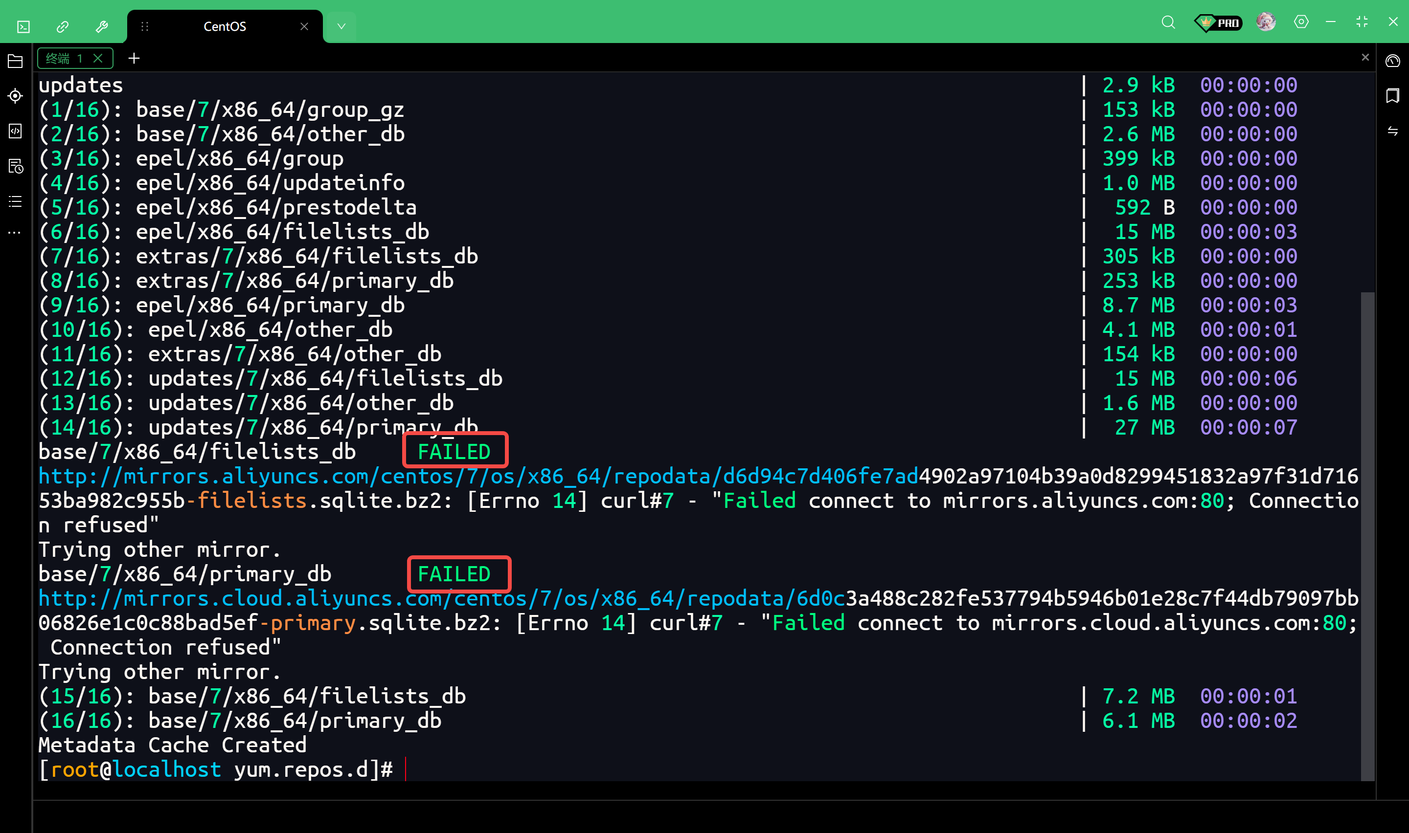 http://mirrors.aliyuncs.com/centos/7/os/x86_64/repodata/d6d94c7d406fe7ad4902a97104b39a0d8299451832a97f31d71653ba982c955b-filelists.sqlite.bz2: [Errno 14] curl#7 - "Failed connect to mirrors.aliyuncs.com:80; Connection refused"