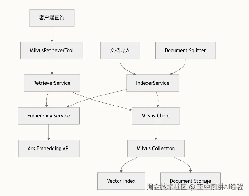 单纯的 Agent 容易产生幻觉。为了保证面试题的专业性,我们引入 Milvus 做知识库。 这里分享一个生产级 RAG 的关键点:混合检索。
