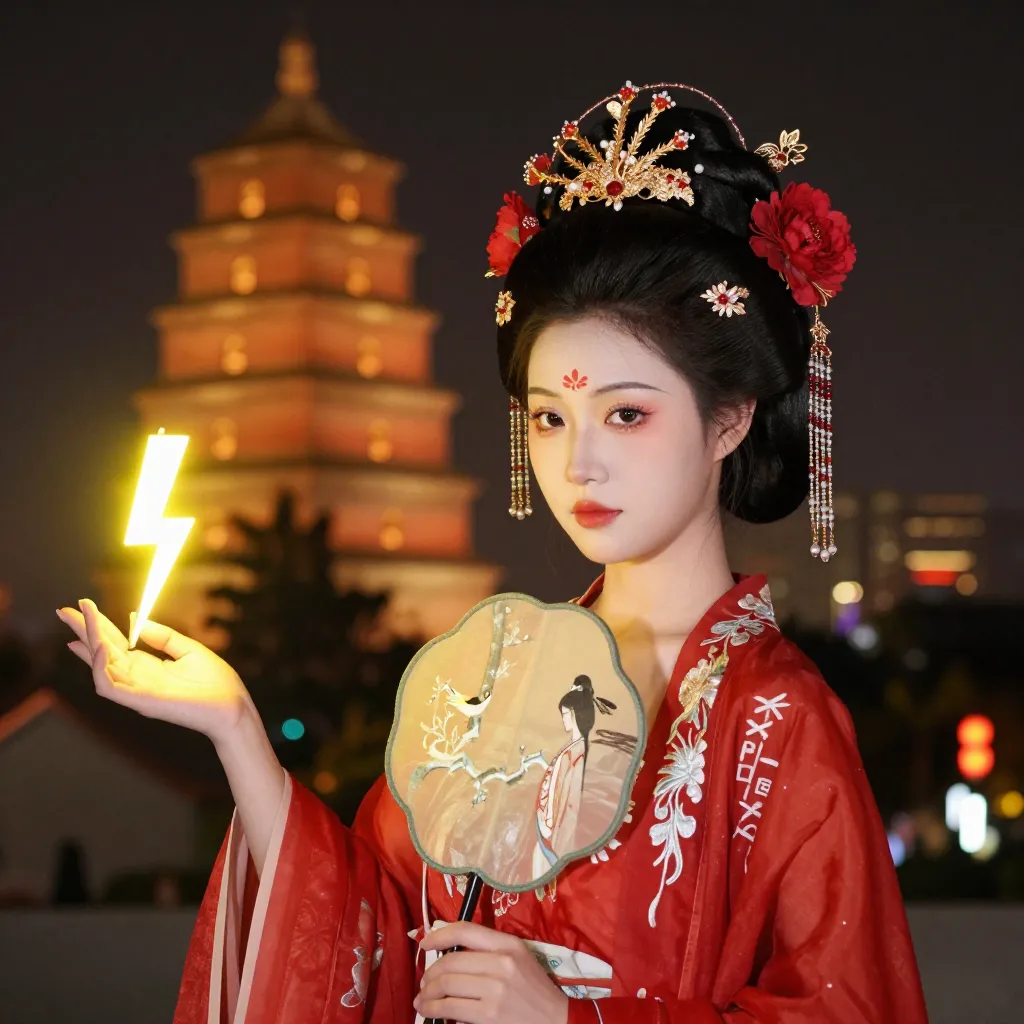 ["Young Chinese woman in red Hanfu, intricate embroidery. Impeccable makeup, red floral forehead pattern. Elaborate high bun, golden phoenix headdress, red flowers, beads. Holds round folding fan with lady, trees, bird. Neon lightning-bolt lamp (⚡️), bright yellow glow, above extended left palm. Soft-lit outdoor night background, silhouetted tiered pagoda (西安大雁塔), blurred colorful distant lights.",
