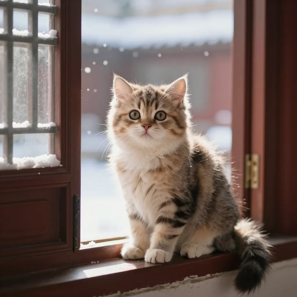 ["一只超级可爱的小猫咪坐在古风窗台上,窗外下雪,毛发蓬松细腻,阳光洒落,写实摄影风格,8k高清", 1024,