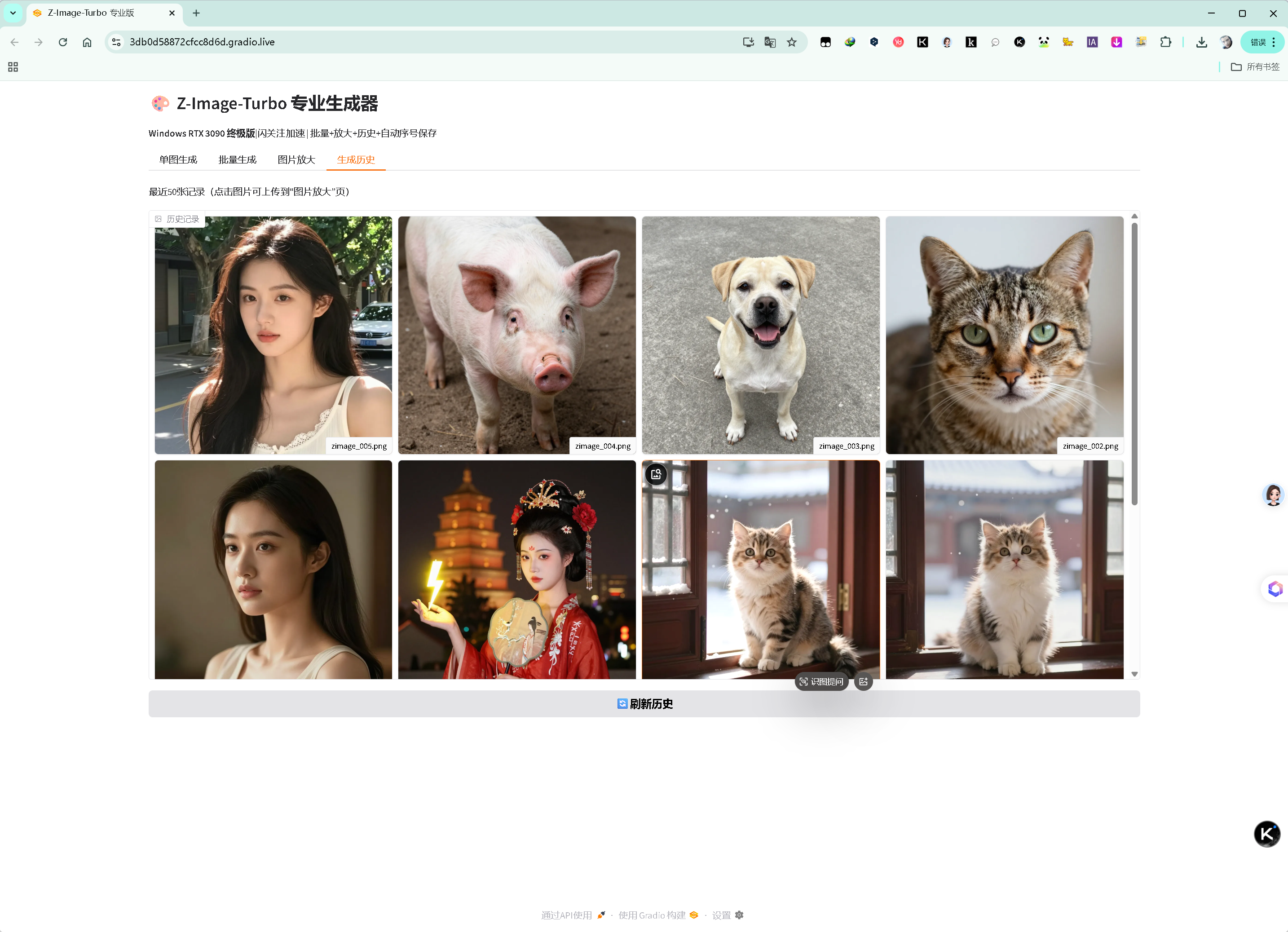 生成历史页(最近 50 张记录,支持点击上传放大)