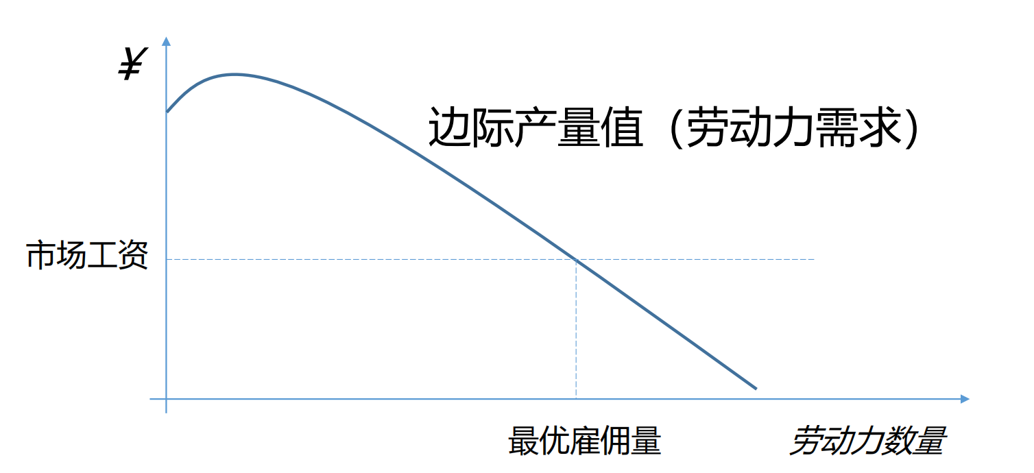- 等同关系:图上明确标注了边际产量值(劳动力需求)。这是一个关键结论:对于完全竞争企业来说,它的边际产量值曲线,本质上就是它对劳动力的需求曲线。因为企业正是根据这条曲线来决定在不同工资水平下雇佣多少人。