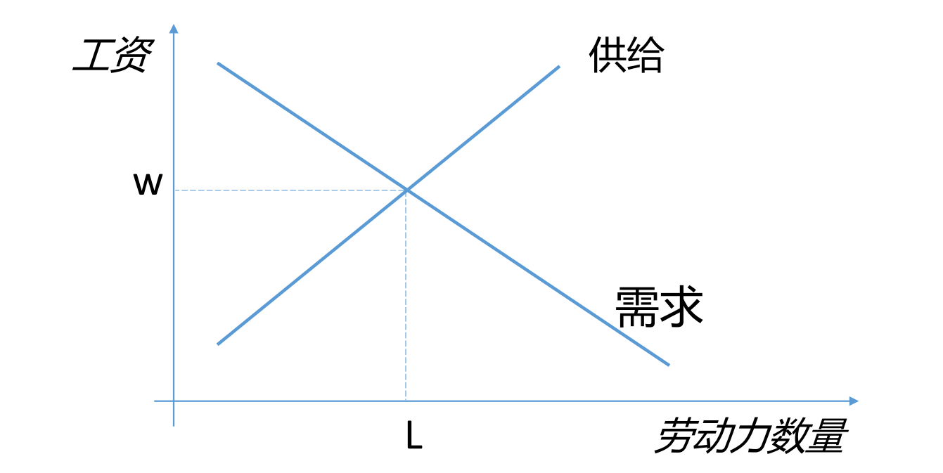 - 供给与需求的交汇:图中向右下方倾斜的蓝色曲线是劳动力需求曲线。它代表了企业在不同工资水平下愿意雇佣的工人数量,反映了劳动力的边际产量值(VMPL)。图中向右上方倾斜的蓝色曲线是劳动力供给曲线。它代表了劳动者在不同工资水平下愿意提供的工作时间或人数。它反映了劳动者在工作与闲暇之间的权衡。这两条曲线的交点,就是市场的均衡点。