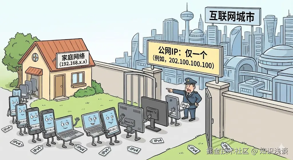 你发现没?你家可能有手机、电脑、平板、智能电视......一堆设备连着同一个Wi-Fi上网。你有没有琢磨过:运营商好像只给了你一个"门牌号"(公网IP),你家这么多"住户"(设备),是怎么同时出门(上网)还不撞车的?