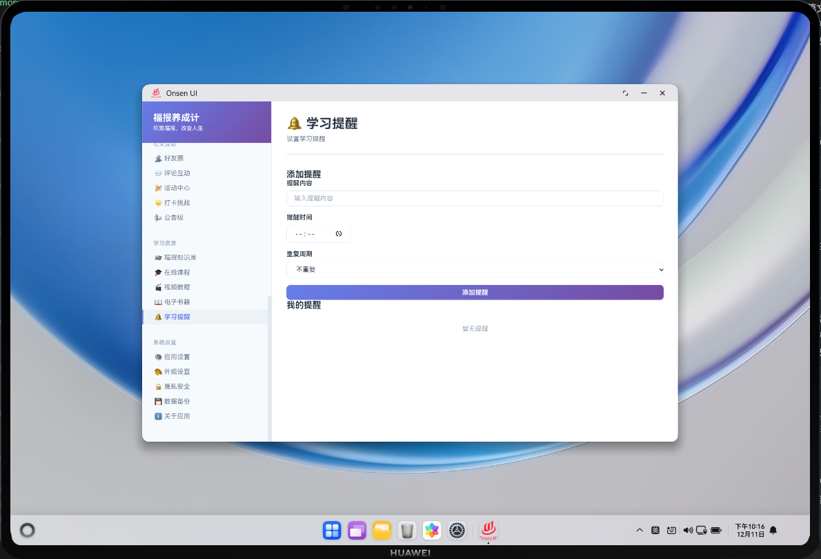 学习提醒模块帮助用户养成定期学习的习惯。关键技术包括:提醒设置、定时通知、提醒管理等。通过 Cordova 与 OpenHarmony 的结合,实现了完整的学习提醒功能。